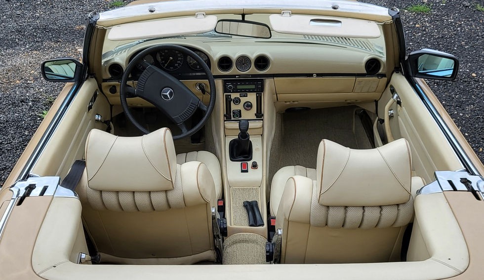 Cette 350 SL est dans sa couleur d’origine (code couleur 430 : 'autumn beige'), qui est une couleur peu commune, disponible uniquement sur les R107 de début de série (entre 1972 et 1975).